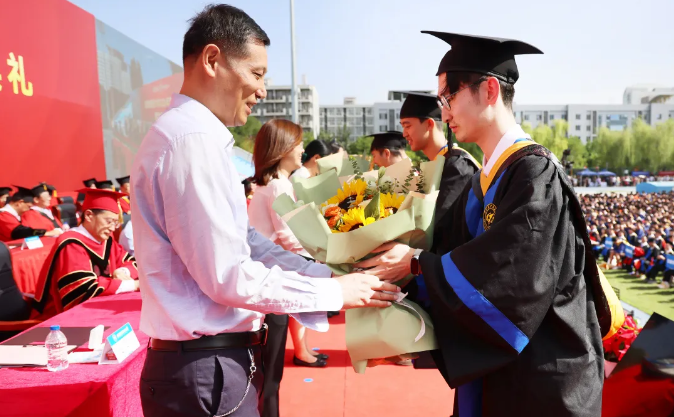 毕业典礼上,毕业生代表手捧鲜花,走向深受爱戴的导师、任课教师、辅导员、班主任、保安、公寓管理员等教职工代表,向在校期间的每一位启蒙者、引路人深深致敬。
