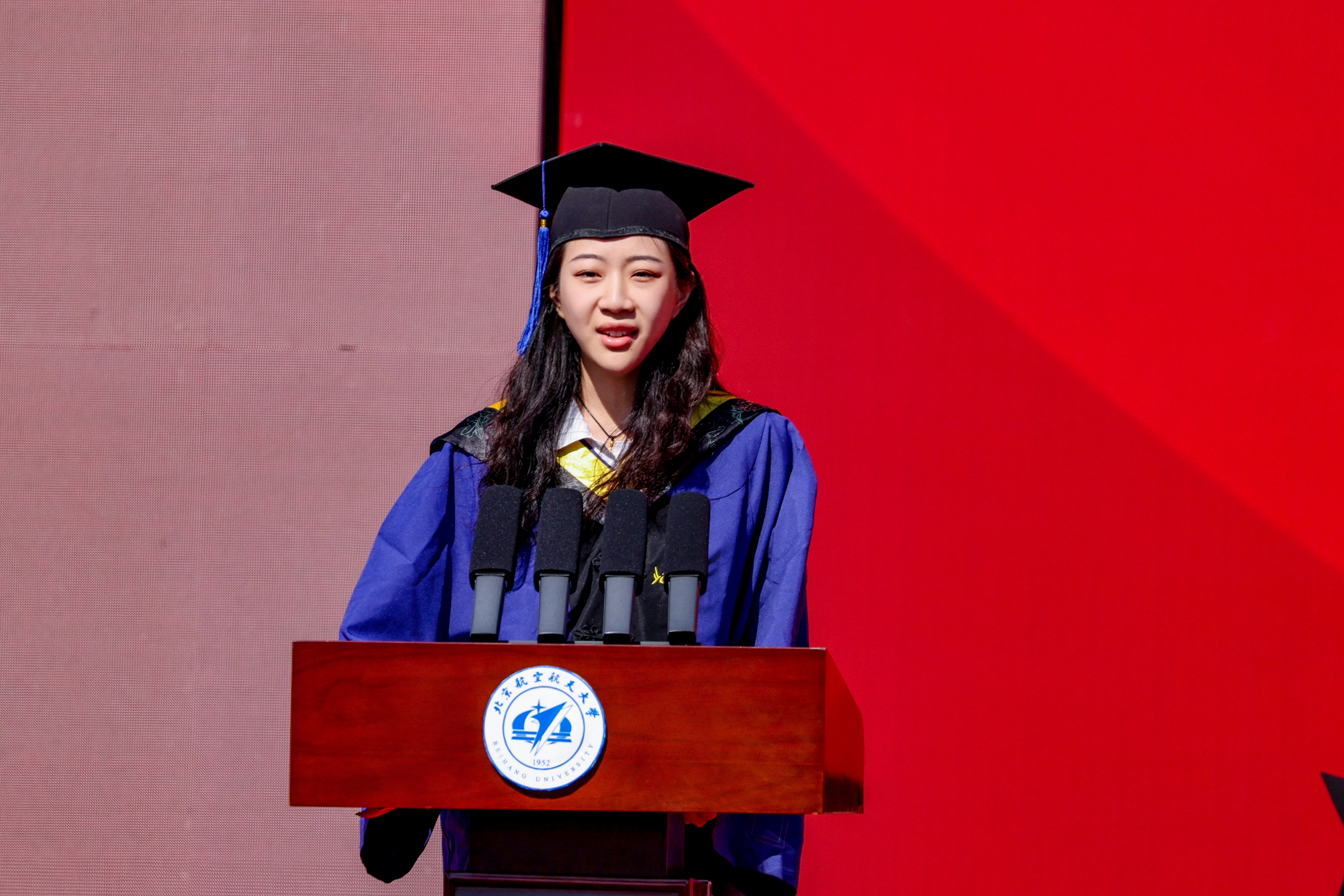研究生毕业生代表、国家卓越工程师学院首届工程硕士毕业生张川宇同学分享了北航求学之路的成长与收获,表达了入职联培企业,扎根航天事业的坚定决心。她号召同学们沉浸“真环境”、解决“真问题”、锻炼“真能力”,在科技自立自强的壮阔征程中,奋力书写无愧于新时代的北航答卷。