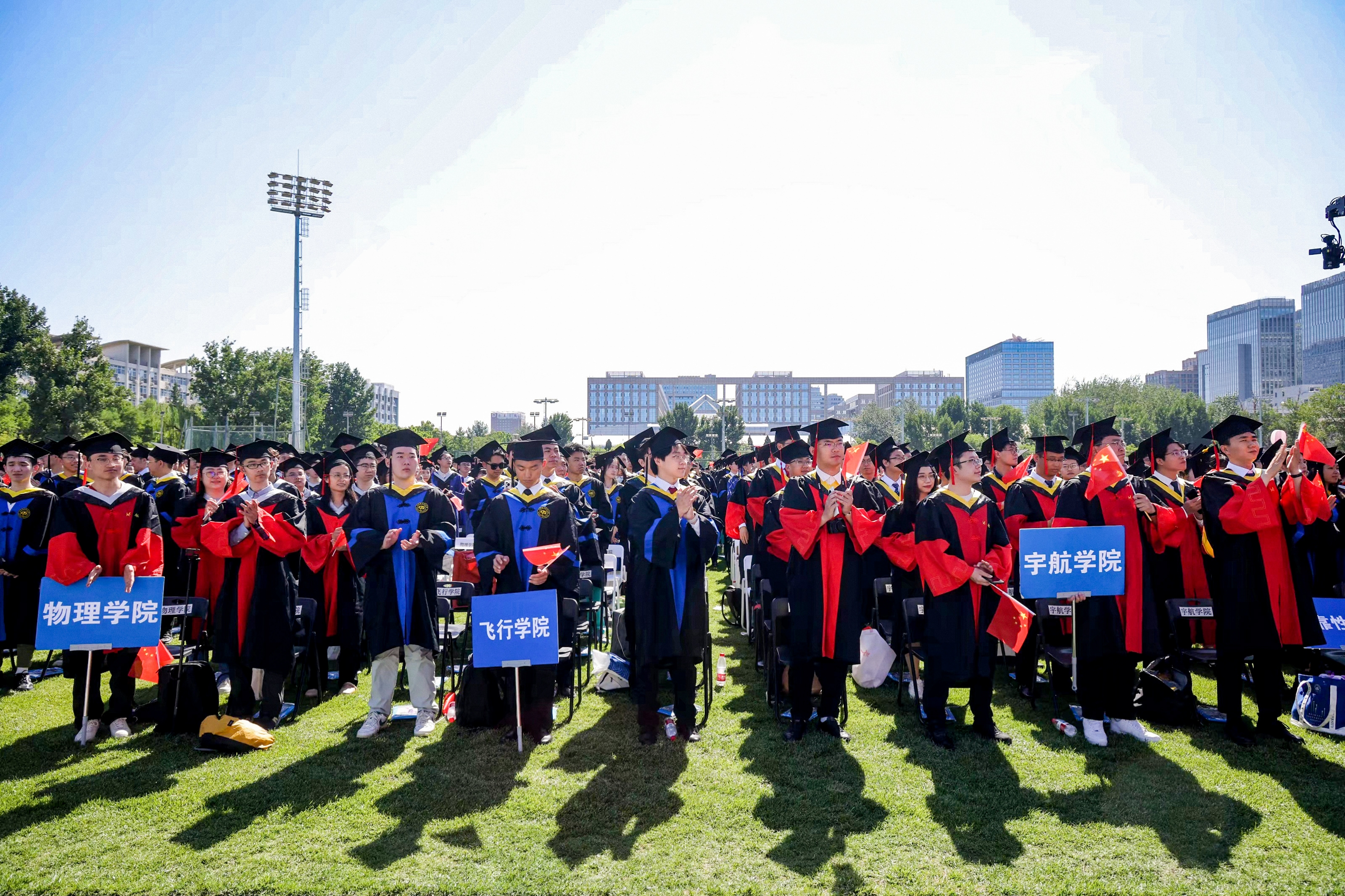 典礼最后,全体师生合唱校歌《仰望星空》,将现场的氛围推向高潮,悠扬的旋律瞬间点燃全场,汇聚成一片情感的海洋。歌声中,有骄傲的笑容在绽放,亦有惜别的泪光在闪烁。砥砺前行,追逐心中理想,扬帆启航,回应时代召唤,母校的目光,将永远为北航人点亮前行的灯塔。
