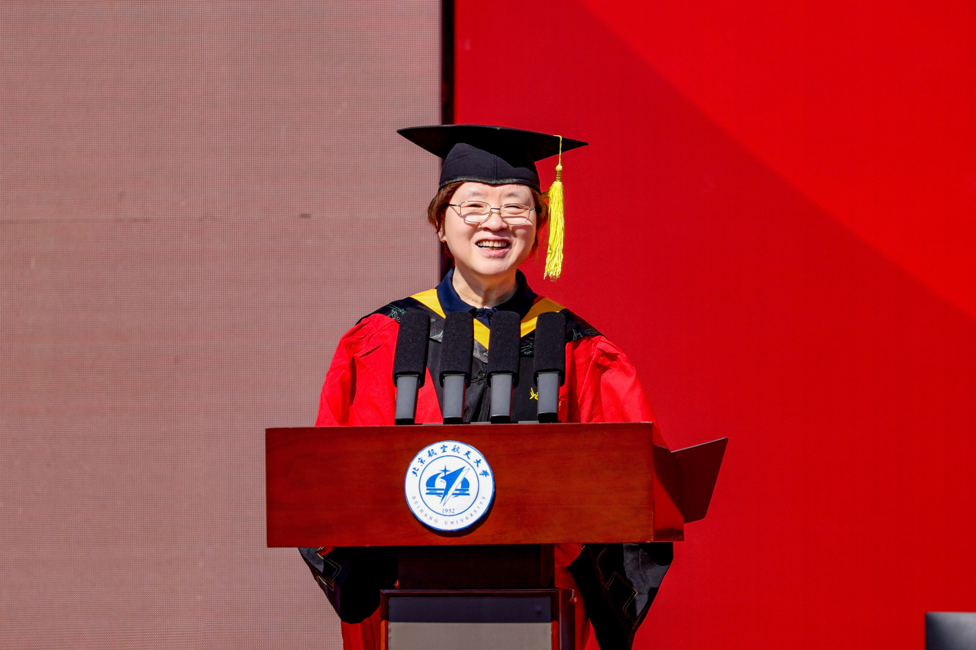 教师代表、电子信息工程学院苏东林院士为全体毕业生送来了嘱托和期许,她寄语同学们“且行不忘来时路”,始终坚守北航人“空天报国”的精神底色,把爱国情、强国志、报国行自觉融入实现伟大梦想的奋斗之中;“且学不倦求索深”,始终保持对知识、技能的饥饿感,常学常新,通过不断学习来蜕变和丰满羽翼;“且闯不惧险峰远”,始终敢于挑战未知,勇敢面对失败,并在不断失败的过程中智慧地蹚出一条自己的路,最终实现从无到有、从0到1的突破。